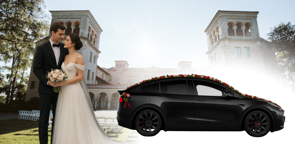 With wedding car service, details are everything. At eCarJax, we offer a luxury wedding car service driven by Tesla that brings a hint of contemporary elegance to your wedding day. Our all-electric Tesla Model Y car service fleet brings a silent, smooth, and sophisticated ride, ideal for a couple that treasures luxury, sophistication, and eco-friendliness.